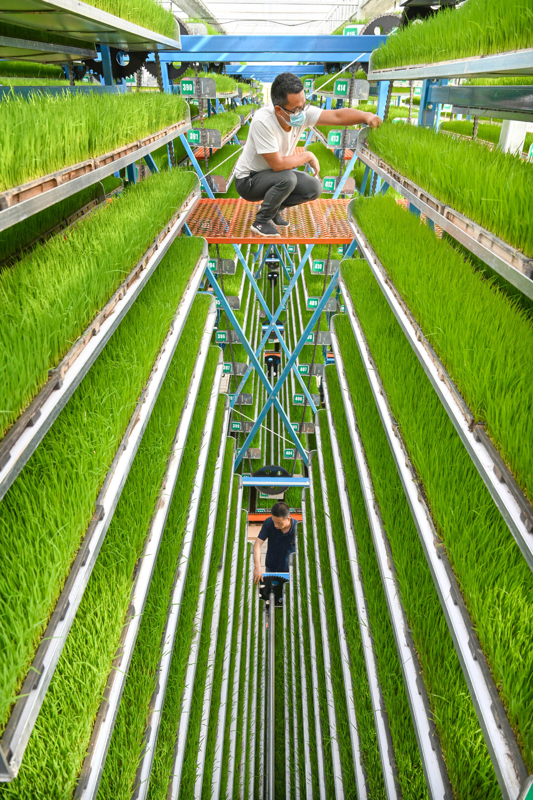 (4月(yuè)11日(rì),益陽市(shì)赫山(shān)區(qū)智慧農(nóng)業(yè)育秧×工(gōng)廠(chǎng),技(jì)術(shù)人(rén)員(yuán)在觀察秧苗的(de)長(cháng)勢情況。郭立∏亮(liàng) 攝)