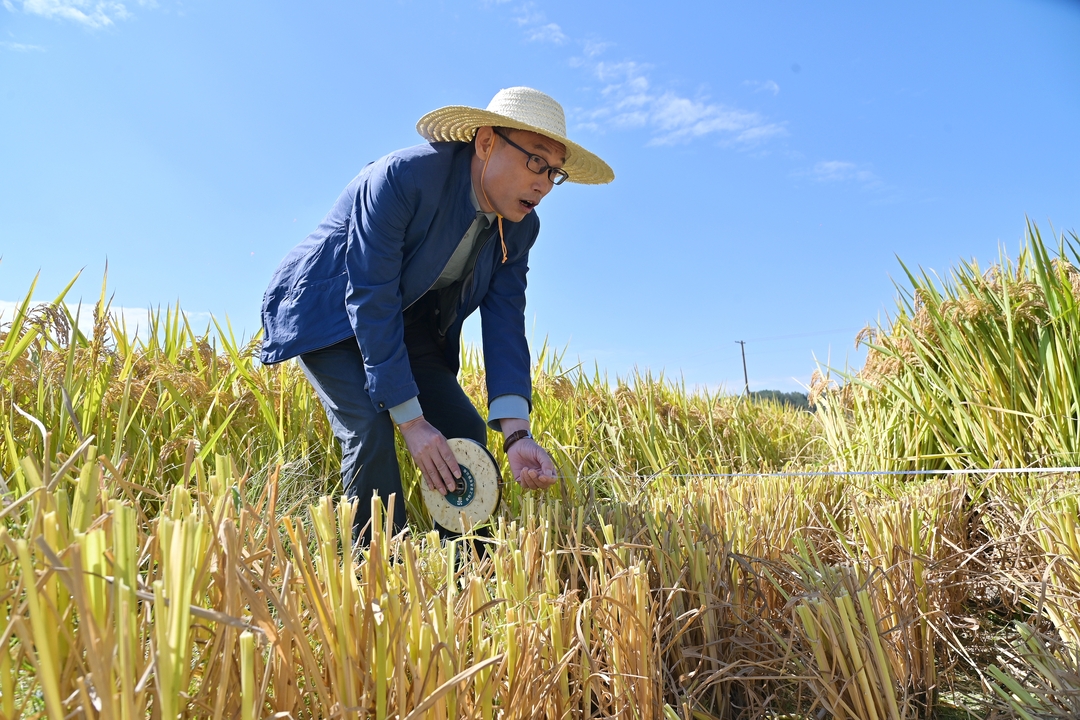 ( 10月(yuè)11日(rì),隆回縣羊古坳鎮雷峰村(cūn)超級稻農(nóng)民(mín)專業(yè)合作(zuò)社,專家(jiā)對(duì)該合作(zuò)社種植的(d e)雜(zá)交水(shuǐ)稻新品種甬優7860高(gāo)産試驗片現(xiàn)場(chǎng)測産。賀上(shàng)升 攝)